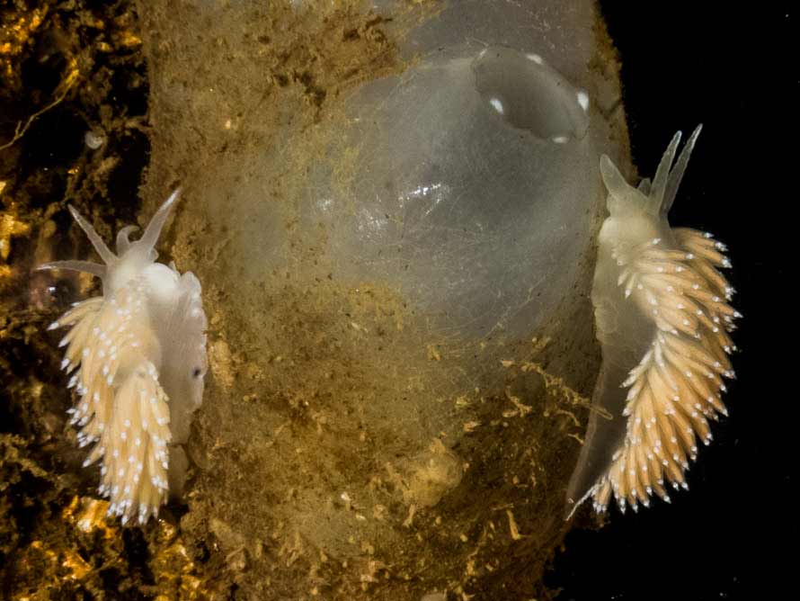 2 x 30 mm animals at 14 metres on the test of a sea squirt. These two are typical of the colour of this species seen at this site during recent dives. Water temperature 10° C.