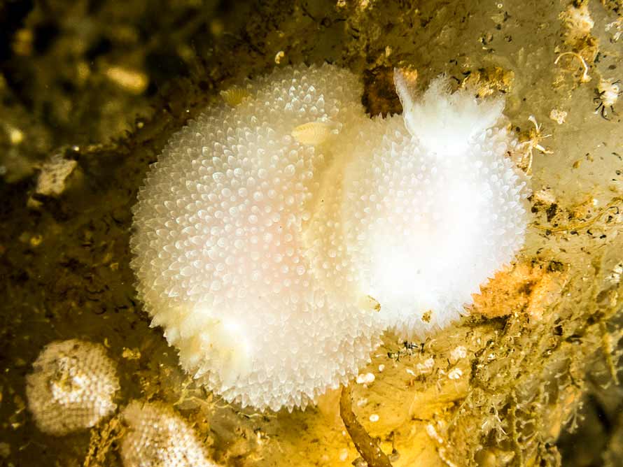 Acanthodoris pilosa (Abildgaard in Müller, 1789)13 November, 2011.12.9 Mile mark, Loch Fyne on the west coast. A mating pair, 35 mm and 25 mm, at 19 m. There were at least 10 individual animals and spawn from 35 - 10 mm over an area of 10 m dia on the reef ledge. Water temperature 12°C. Sony NEX-5 in Nauticam housing, 18-55mm lens, +5 dioptre and 2 x Inon D-2000 flashes. | |||