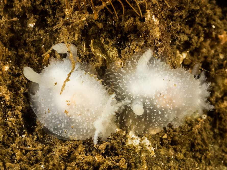 Acanthodoris pilosa (Abildgaard in Müller, 1789)19 October, 2012.Lephinchapel, Loch Fyne on the west coast. 2 x 18 mm animals at 14 metres in 12° C water. Sony NEX-5 in Nauticam housing, 18-55mm lens, SubSee +10 dioptre and 2 x Inon D-2000 flashes. | |||
