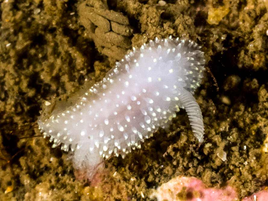 Acanthodoris pilosa (Abildgaard in Müller, 1789)17 February, 2013.Lephinchapel, Loch Fyne on the west coast. 4 mm juvenile animal at 9 metres in 7° C water. Sony NEX-5 in Nauticam housing, 18-55mm lens, SubSee +10 dioptre and 2 x Inon D-2000 flashes. | |||