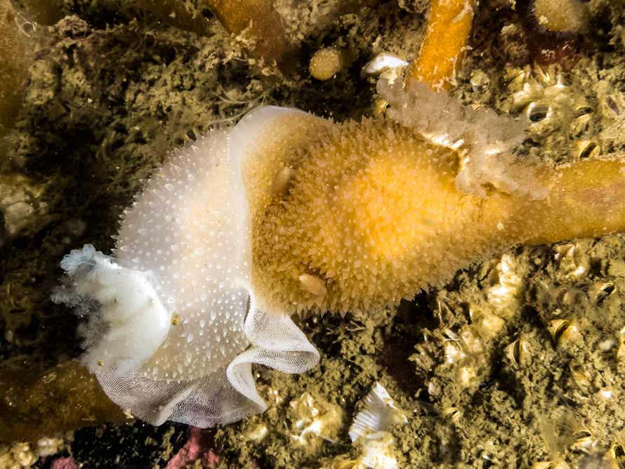 Acanthodoris pilosa (Abildgaard in Müller, 1789)13 August, 2014.The south end of Calve Island, Sound of Mull on the west coast . 2 x 28 mm animals with spawn on the finger bryazoan, Alcyonidium diaphanum, at 18 metres. Many animals from 15 - 35 mm size with spawn and in a range of colours between the two forms above. Water temperature 13°C. Sony α6000 in Nauticam housing, 18-55mm lens, SubSee +10 dioptre and 2 x Inon D-2000 flashes | |||