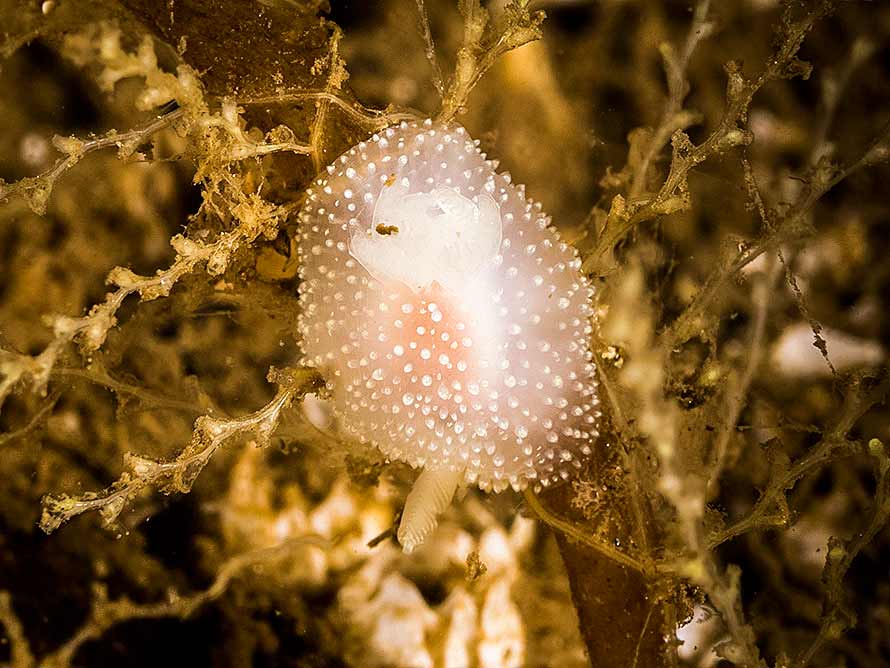 Acanthodoris pilosa (Abildgaard in Müller, 1789)30 November, 2014.South Gortein, Loch Fyne on the west coast . 3 mm juvenile on Finger bryozoan, Alcyonidium diaphanum, at 20 metres. Water temperature 11°C. Sony α6000 in Nauticam housing, 50 mm Zeiss Touit macro lens and 2 x Inon D-2000 flashes | |||