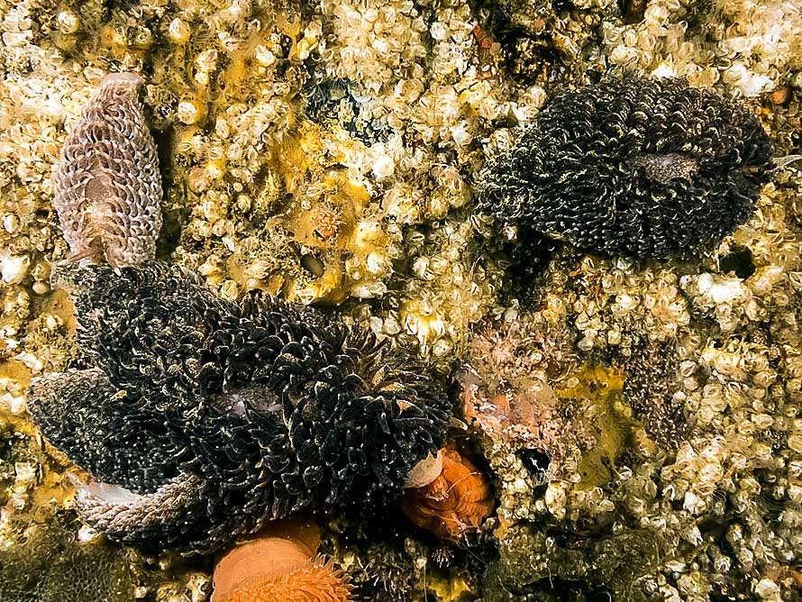 Aeolidia papillosa (Linnaeus, 1761)15 May, 2013.Inverkip Pier, Firth of Clyde on the west coast. Small group of 5 animals, the larger being 55 mm animal, at 8 metres Big spawn masses and many more specimens also seen. Water temperature 8.5°C. Sony NEX-5 in Nauticam housing, 18-55mm lens and 2 x Inon D-2000 flashes. | |||