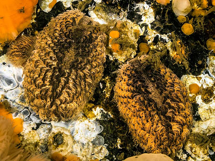 Aeolidia papillosa (Linnaeus, 1761)24 November, 2014.Inverkip Pier, Firth of Clyde on the west coast. A small group of feeding animals on a pier leg at 12 metres. The larger specimens were approx. 50 mm long. Water temperature 11°C. Sony α6000 in Nauticam housing, Zeiss 50 mm macro lens and 2 x Inon D-2000 flashes. | |||