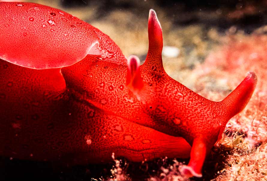 Finning along with the camera set for 1:1 macro we found this 80-100mm long Sea Hare on a rock at 12 metres.