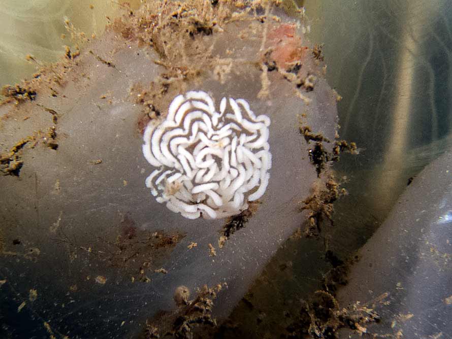 One of several spawn masses amid a number of animals on these