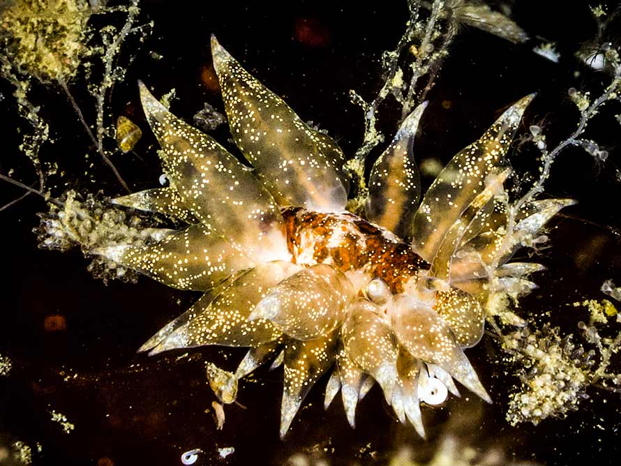 Eubranchus linensis Garcia-Gomez, Cervera & Garcia, 1990 21 October, 2015. Cava Island, Scapa Flow in the Orkney Islands. 18 mm animal at 15 metres. Water temperature 11°C. Sony α6000 in Nauticam housing, Zeiss 50 mm macro lens and 2 x Inon D-2000 flashes. |