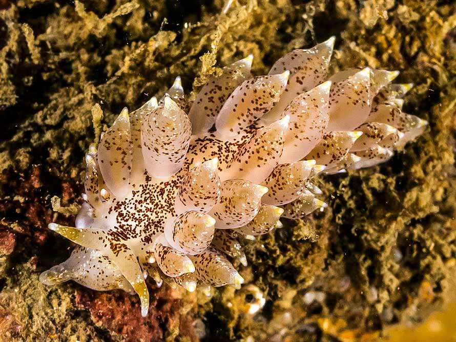 Eubranchus pallidus (Alder & Hancock, 1842) 10 April 2013. Inverkip Pier, Firth of Clyde on the west coast. 30 mm animal at 8.5 m. Water temperature 7° C. Sony NEX-5 in Nauticam housing, 18-55mm lens with SubSee +10 dioptre and 2 x Inon D-2000 flashes. |