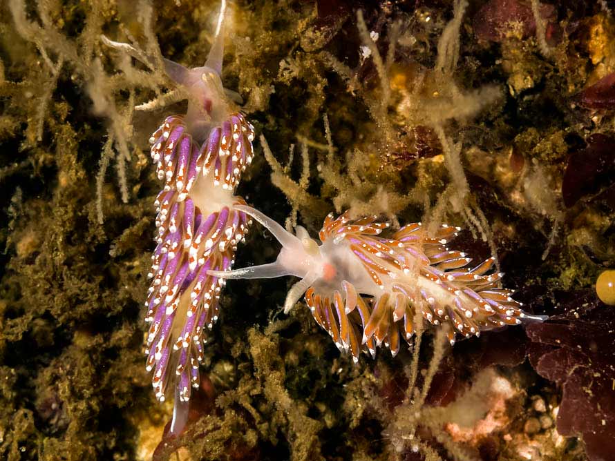 A colourful pair of 35 mm animals, 2 of a group of 4 on a pier leg at 5.5 m. Water temperature