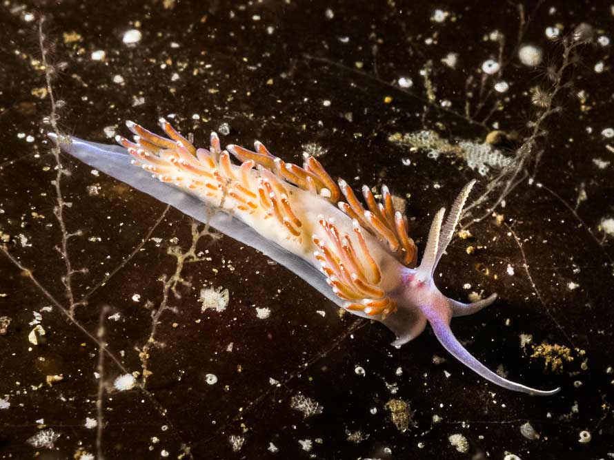 40 mm animal at 12 metres on kelp. Water temperature 13° C.