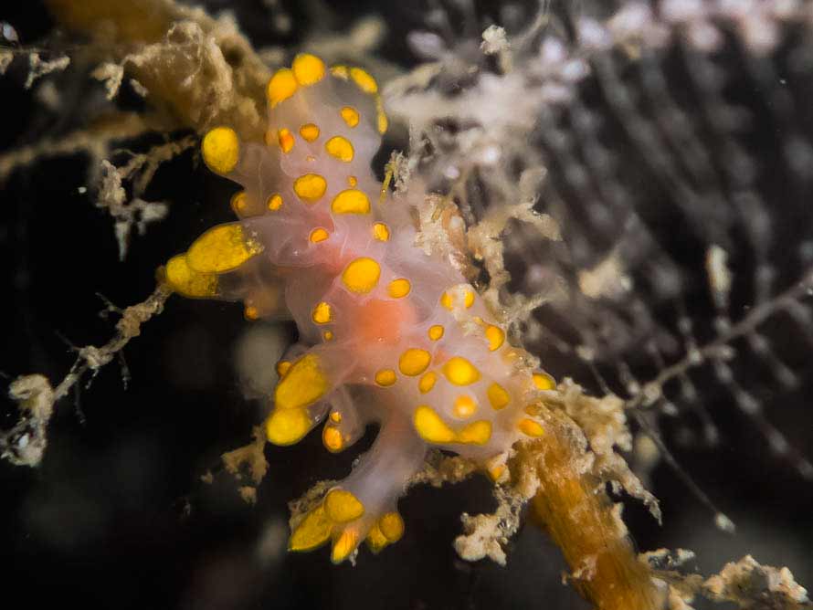 28 mm juvenile animal at 20 metres on hydroid. Water temperature 12 °C.