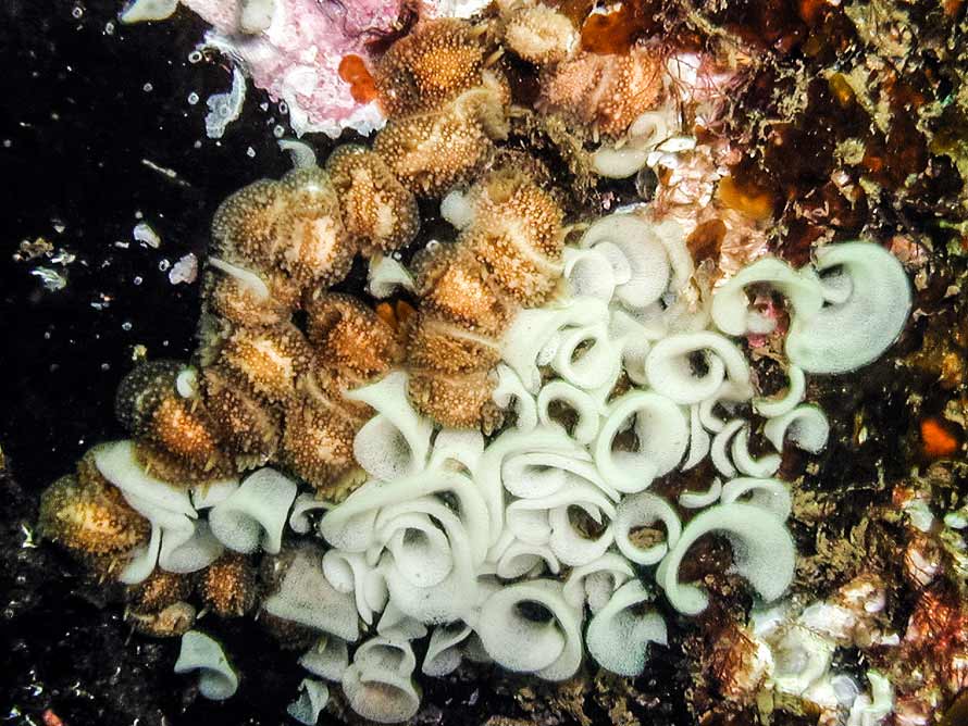 of animals with their spawn on the rocky reef. Patches of spawn and nudibranchs