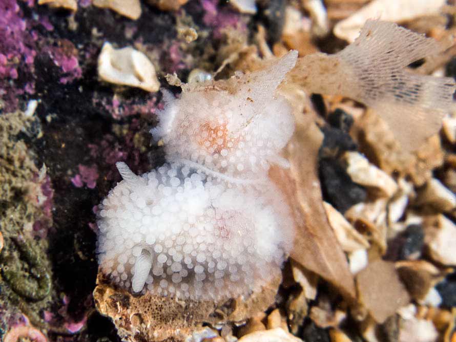 A pair of animals, the larger 6 mm, in 24 metres. Water temperature 9.5°C.
