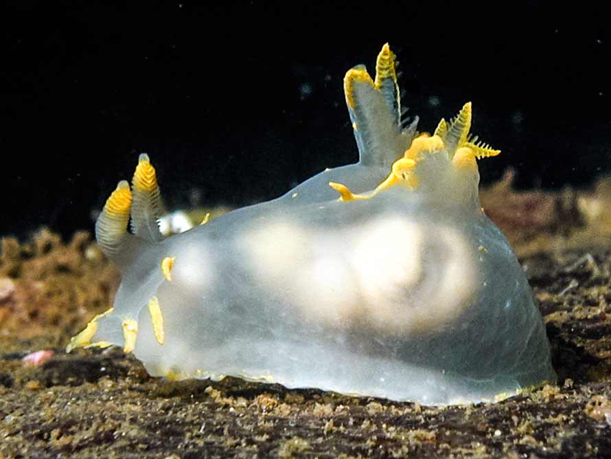 on the rocky reef at 14 metres in 12° C water with an egg mass close