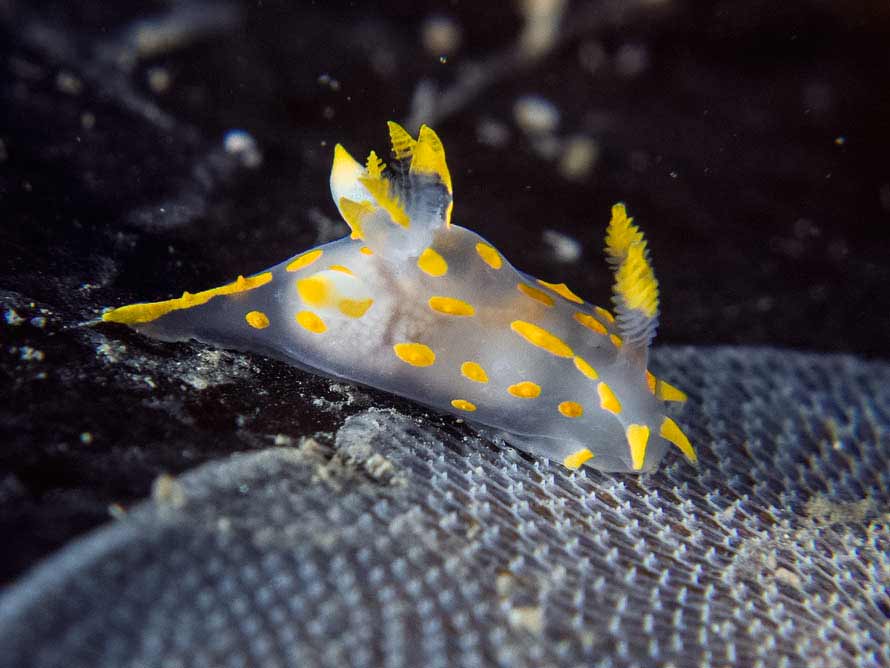 Single 12 mm animal at 14 metres feeding on the bryazoon Membranipora membranacea on the underside of a kelp blade.