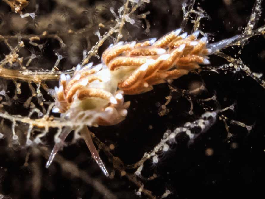 At 13 metres in 11° C water, one of several animals on the hydroids with their spawn.