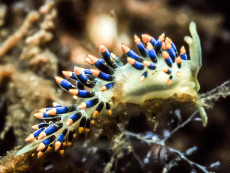 Tenellia cuanensis (Korshunova et al, 2019) 25 March,2001. At Lephinchapel Reef, Loch Fyne on the west coast. 12 mm long animal on hydroid at 16 metres in 7° C water and photographed with 2:1 close up extension tubes on Nikonos 5 and single Ikelite 50 flash. |